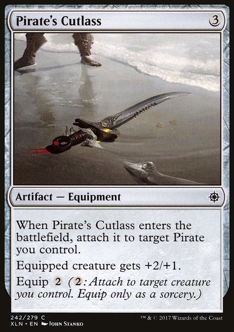 When this Equipment enters, attach it to target Pirate you control. Equipped creature gets +2/+1. Equip {2} ({2}: Attach to target creature you control. Equip only as a sorcery.)