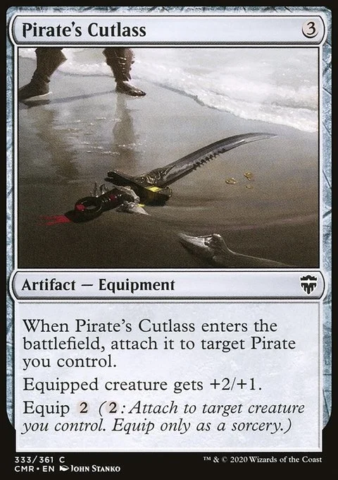 When this Equipment enters, attach it to target Pirate you control. Equipped creature gets +2/+1. Equip {2} ({2}: Attach to target creature you control. Equip only as a sorcery.)