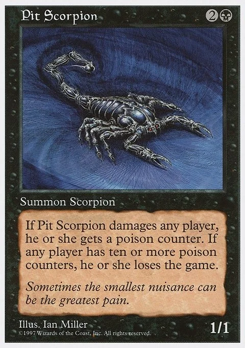 Whenever Pit Scorpion deals damage to a player, that player gets a poison counter. (A player with ten or more poison counters loses the game.)
