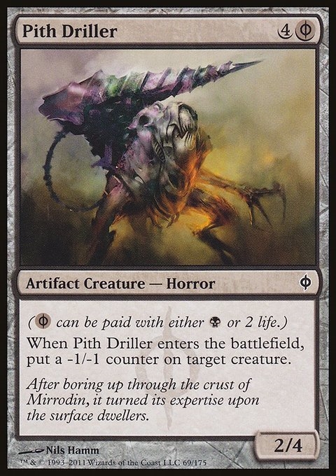 ({B/P} can be paid with either {B} or 2 life.) When Pith Driller enters the battlefield, put a -1/-1 counter on target creature.