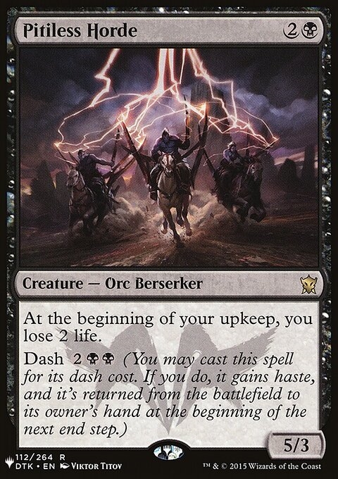 At the beginning of your upkeep, you lose 2 life. Dash {2}{B}{B} (You may cast this spell for its dash cost. If you do, it gains haste, and it's returned from the battlefield to its owner's hand at the beginning of the next end step.)