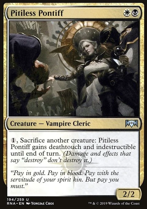 {1}, Sacrifice another creature: Pitiless Pontiff gains deathtouch and indestructible until end of turn. (Damage and effects that say "destroy" don't destroy it.)