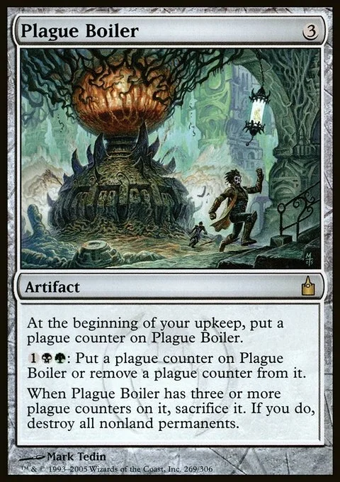 When Plague Boiler has three or more plague counters on it, sacrifice it. If you do, destroy all nonland permanents.