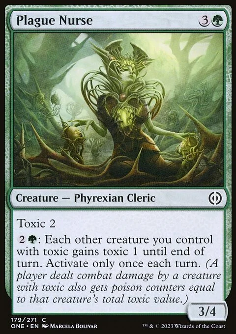 Toxic 2 {2}{G}: Each other creature you control with toxic gains toxic 1 until end of turn. Activate only once each turn. (A player dealt combat damage by a creature with toxic also gets poison counters equal to that creature's total toxic value.)