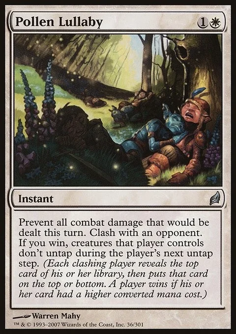 Prevent all combat damage that would be dealt this turn. Clash with an opponent. If you win, creatures that player controls don't untap during the player's next untap step. (Each clashing player reveals the top card of their library, then puts that card on the top or bottom. A player wins if their card had a higher mana value.)