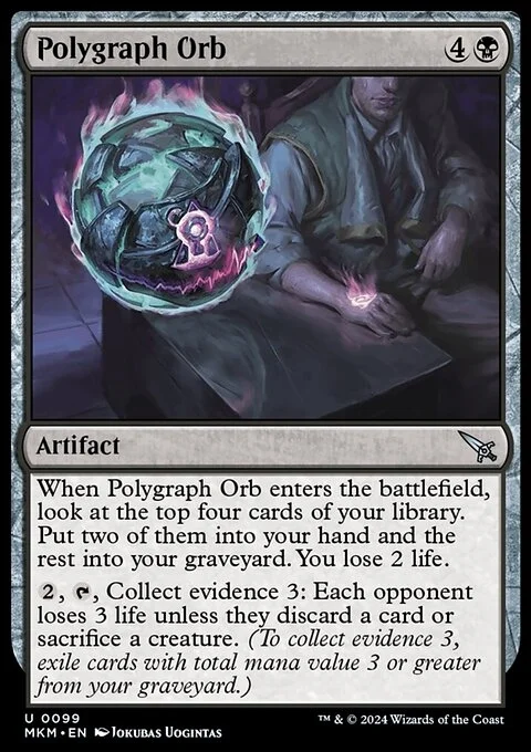 When Polygraph Orb enters the battlefield, look at the top four cards of your library. Put two of them into your hand and the rest into your graveyard. You lose 2 life.
