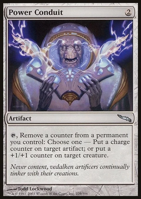 {T}, Remove a counter from a permanent you control: Choose one — • Put a charge counter on target artifact. • Put a +1/+1 counter on target creature.