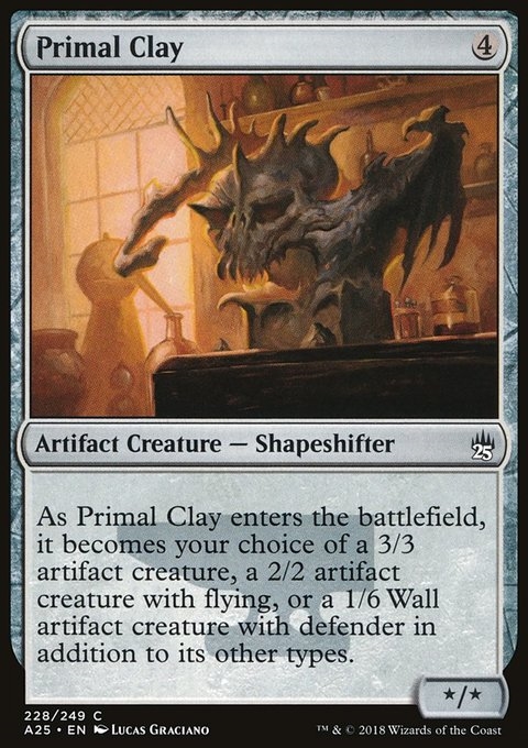 As Primal Clay enters the battlefield, it becomes your choice of a 3/3 artifact creature, a 2/2 artifact creature with flying, or a 1/6 Wall artifact creature with defender in addition to its other types. (A creature with defender can't attack.)