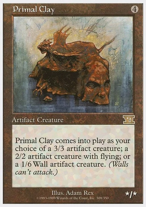 Primal Clay comes into play as your choice of a 3/3 artifact creature; a 2/2 artifact creature with flying; or a 1/6 Wall artifact creature. (Walls can’t attack.)