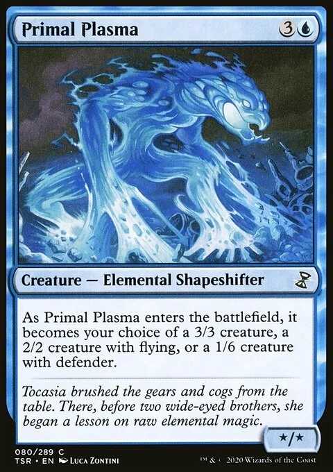 As Primal Plasma enters the battlefield, it becomes your choice of a 3/3 creature, a 2/2 creature with flying, or a 1/6 creature with defender.