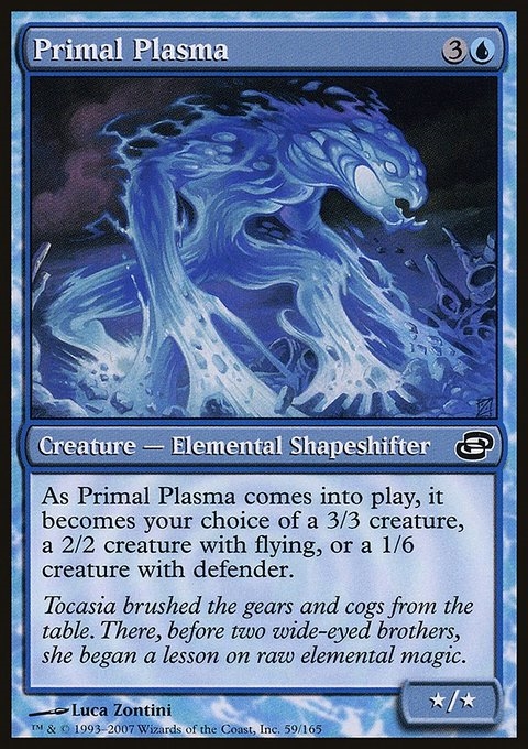 As Primal Plasma enters, it becomes your choice of a 3/3 creature, a 2/2 creature with flying, or a 1/6 creature with defender.