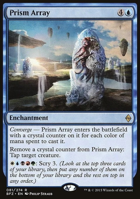 Converge — Prism Array enters the battlefield with a crystal counter on it for each color of mana spent to cast it. Remove a crystal counter from Prism Array: Tap target creature. {W}{U}{B}{R}{G}: Scry 3. (Look at the top three cards of your library, then put any number of them on the bottom of your library and the rest on top in any order.)
