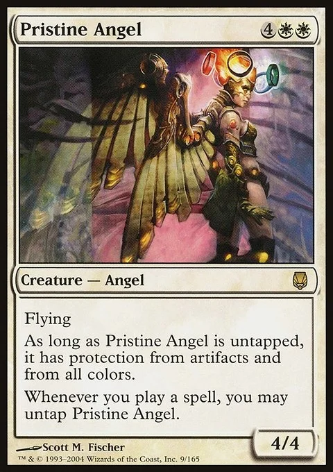 Flying As long as Pristine Angel is untapped, it has protection from artifacts and from all colors. Whenever you cast a spell, you may untap Pristine Angel.