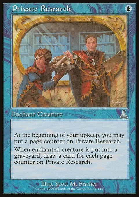 At the beginning of your upkeep, you may put a page counter on Private Research.When enchanted creature is put into a graveyard, draw a card for each page counter on Private Research.