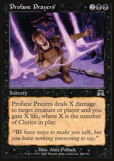 Profane Prayers deals X damage to any target and you gain X life, where X is the number of Clerics on the battlefield.