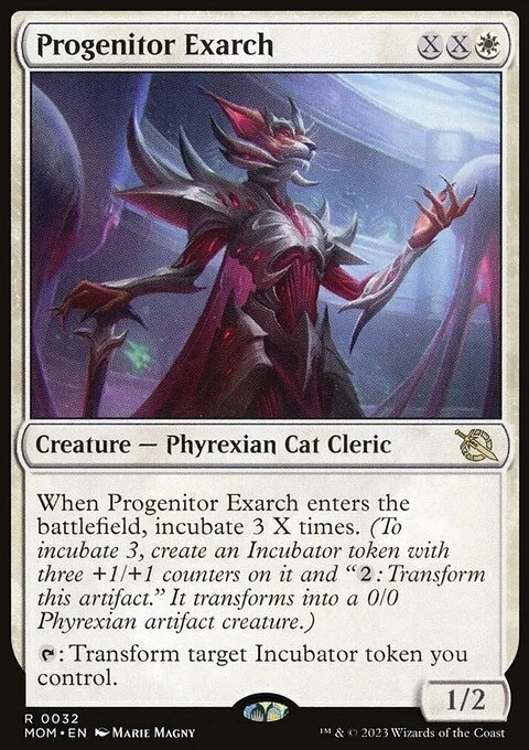 When Progenitor Exarch enters the battlefield, incubate 3 X times. (To incubate 3, create an Incubator token with three +1/+1 counters on it and "{2}: Transform this artifact." It transforms into a 0/0 Phyrexian artifact creature.)