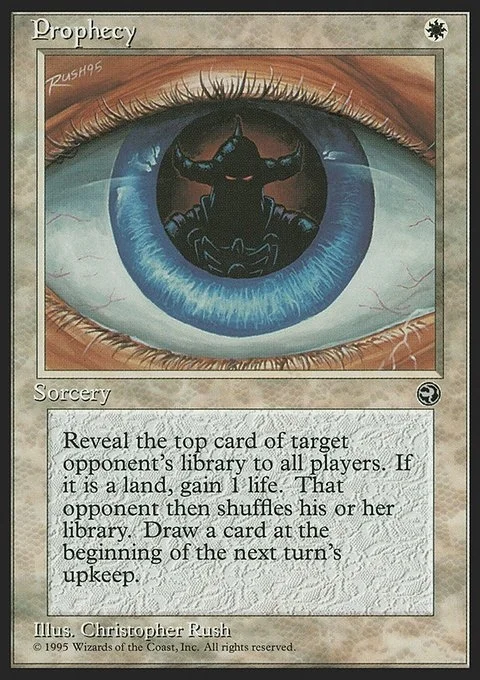 Reveal the top card of target opponent's library. If it's a land, you gain 1 life. Then that player shuffles. Draw a card at the beginning of the next turn's upkeep.