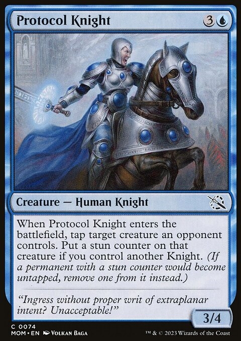 When this creature enters, tap target creature an opponent controls. Put a stun counter on that creature if you control another Knight. (If a permanent with a stun counter would become untapped, remove one from it instead.)