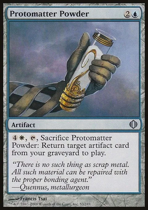{4}{W}, {T}, Sacrifice Protomatter Powder: Return target artifact card from your graveyard to the battlefield.