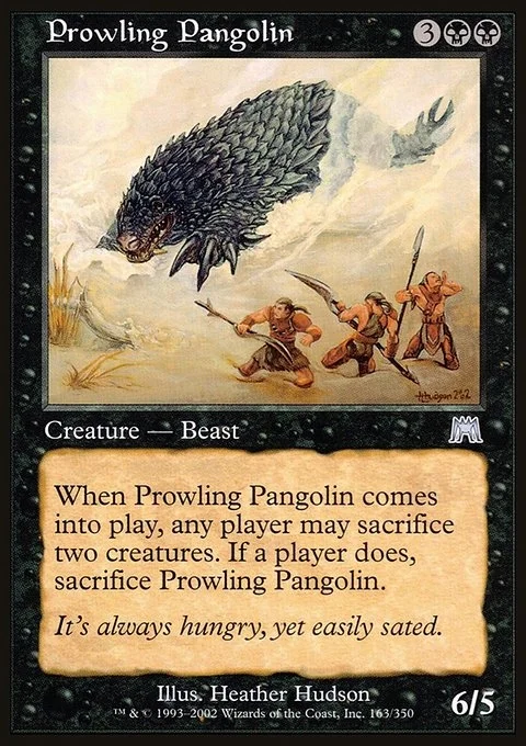 When Prowling Pangolin enters the battlefield, any player may sacrifice two creatures. If a player does, sacrifice Prowling Pangolin.