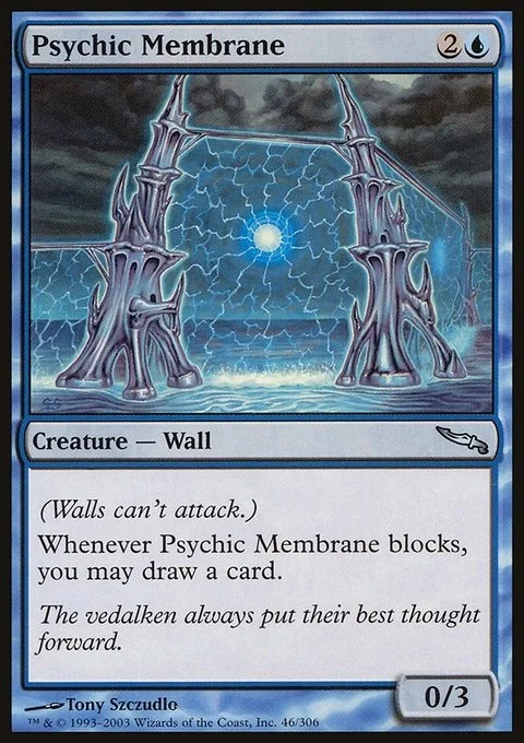 Defender (This creature can't attack.) Whenever Psychic Membrane blocks, you may draw a card.
