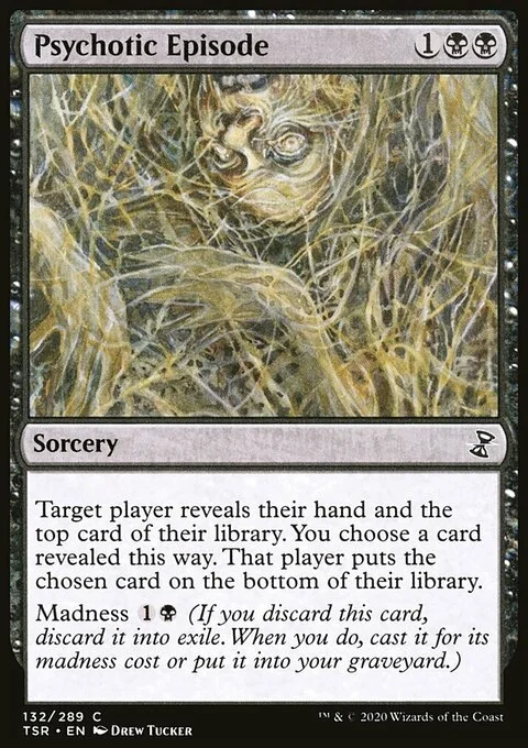 Target player reveals their hand and the top card of their library. You choose a card revealed this way. That player puts the chosen card on the bottom of their library. Madness {1}{B} (If you discard this card, discard it into exile. When you do, cast it for its madness cost or put it into your graveyard.)