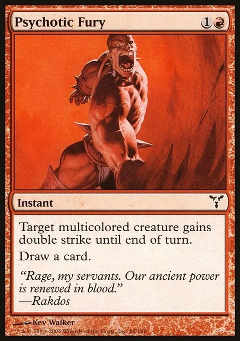 Target multicolored creature gains double strike until end of turn. Draw a card.