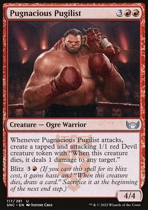 Whenever Pugnacious Pugilist attacks, create a tapped and attacking 1/1 red Devil creature token with "When this creature dies, it deals 1 damage to any target."