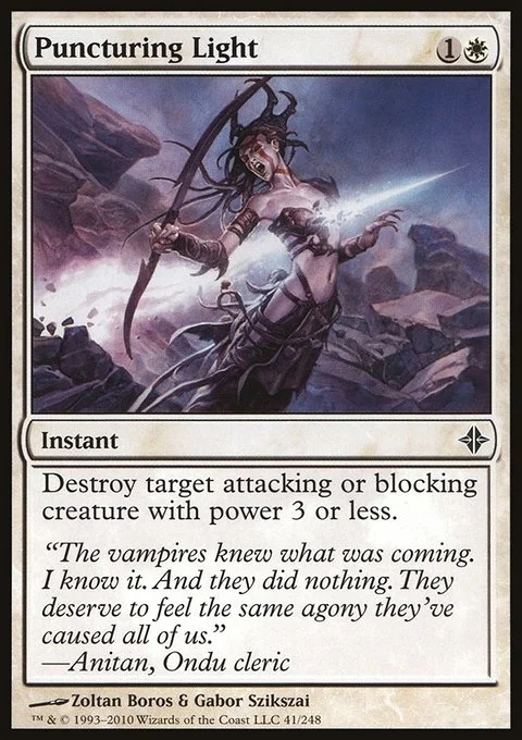 Destroy target attacking or blocking creature with power 3 or less.