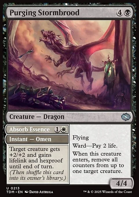 Purging Stormbrood Flying Ward—Pay 2 life. When this creature enters, remove all counters from up to one target creature. Absorb Essence Target creature gets +2/+2 and gains lifelink and hexproof until end of turn. (Then shuffle this card into its owner's library.)