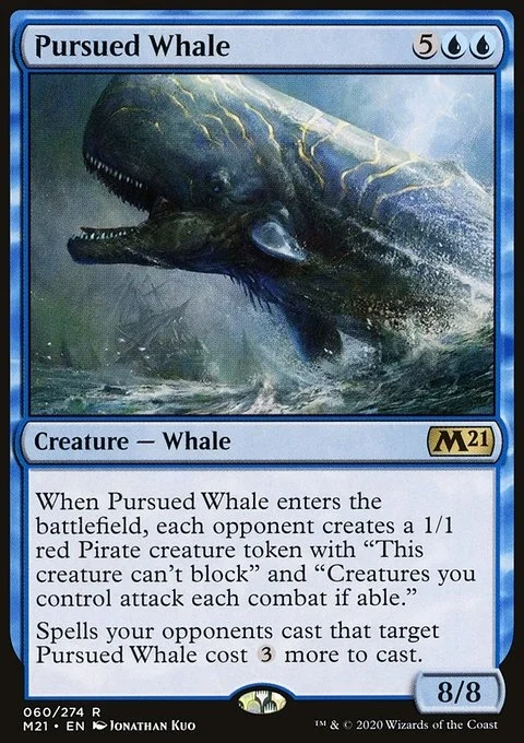 When Pursued Whale enters the battlefield, each opponent creates a 1/1 red Pirate creature token with "This creature can't block" and "Creatures you control attack each combat if able." Spells your opponents cast that target Pursued Whale cost {3} more to cast.