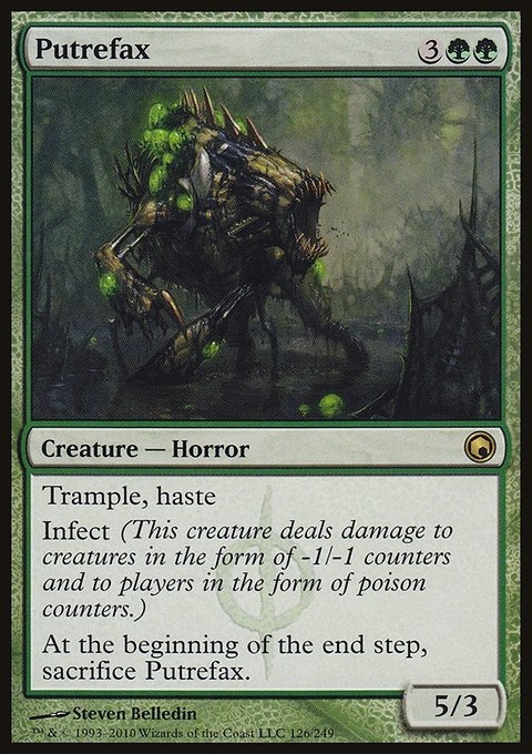 Trample, haste Infect (This creature deals damage to creatures in the form of -1/-1 counters and to players in the form of poison counters.) At the beginning of the end step, sacrifice Putrefax.
