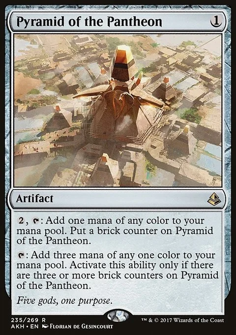 {2}, {T}: Add one mana of any color. Put a brick counter on Pyramid of the Pantheon. {T}: Add three mana of any one color. Activate only if there are three or more brick counters on Pyramid of the Pantheon.