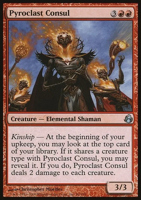 Kinship — At the beginning of your upkeep, you may look at the top card of your library. If it shares a creature type with Pyroclast Consul, you may reveal it. If you do, Pyroclast Consul deals 2 damage to each creature.
