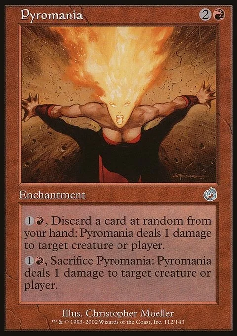 {1}{R}, Discard a card at random: Pyromania deals 1 damage to any target. {1}{R}, Sacrifice Pyromania: It deals 1 damage to any target.