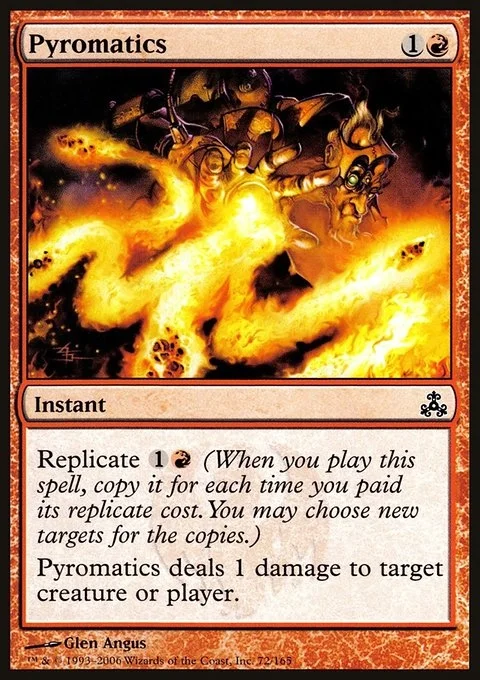 Replicate {1}{R} (When you cast this spell, copy it for each time you paid its replicate cost. You may choose new targets for the copies.) Pyromatics deals 1 damage to any target.