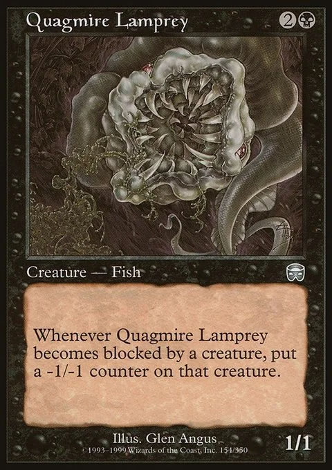 Whenever Quagmire Lamprey becomes blocked by a creature, put a -1/-1 counter on that creature.