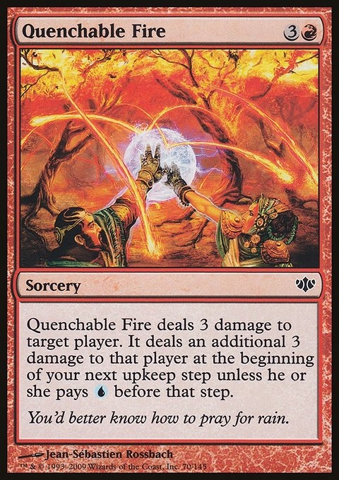 Quenchable Fire deals 3 damage to target player or planeswalker. It deals an additional 3 damage to that player or planeswalker at the beginning of your next upkeep step unless that player or that planeswalker's controller pays {U} before that step.