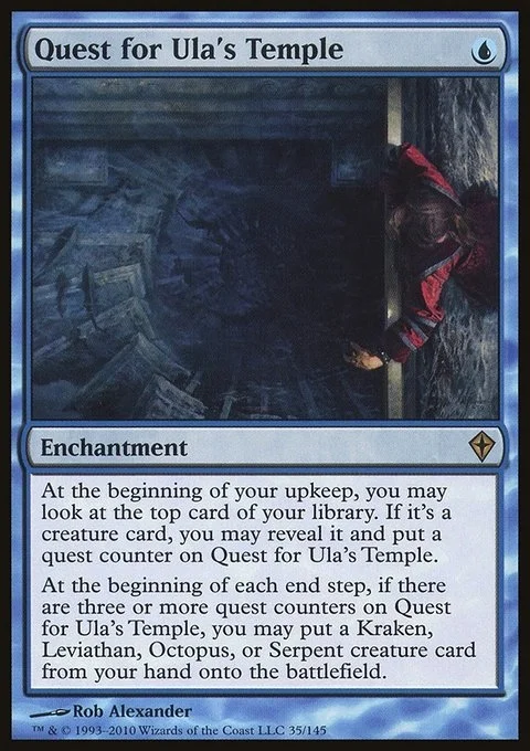 At the beginning of each end step, if there are three or more quest counters on Quest for Ula's Temple, you may put a Kraken, Leviathan, Octopus, or Serpent creature card from your hand onto the battlefield.