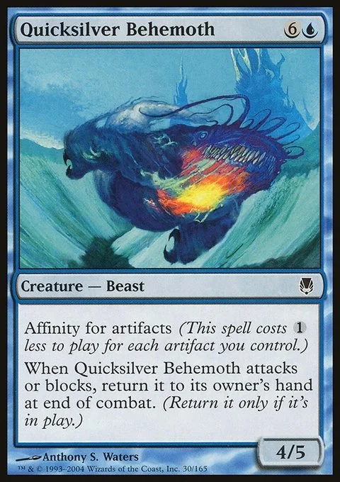 Affinity for artifacts (This spell costs {1} less to cast for each artifact you control.) When Quicksilver Behemoth attacks or blocks, return it to its owner's hand at end of combat. (Return it only if it's on the battlefield.)