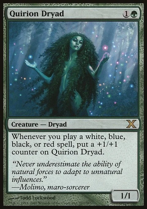 Whenever you cast a spell that's white, blue, black, or red, put a +1/+1 counter on Quirion Dryad.