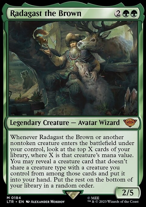 Whenever Radagast or another nontoken creature you control enters, look at the top X cards of your library, where X is that creature's mana value. You may reveal a creature card that doesn't share a creature type with a creature you control from among those cards and put it into your hand. Put the rest on the bottom of your library in a random order.
