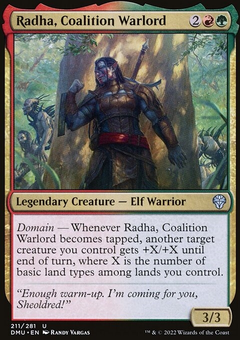 Domain — Whenever Radha, Coalition Warlord becomes tapped, another target creature you control gets +X/+X until end of turn, where X is the number of basic land types among lands you control.