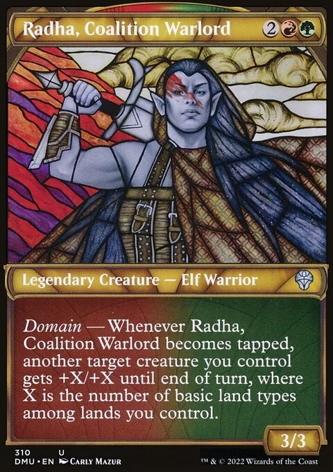 Domain — Whenever Radha, Coalition Warlord becomes tapped, another target creature you control gets +X/+X until end of turn, where X is the number of basic land types among lands you control.