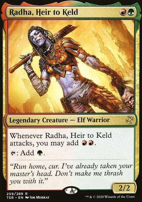 Whenever Radha, Heir to Keld attacks, you may add {R}{R}. {T}: Add {G}.