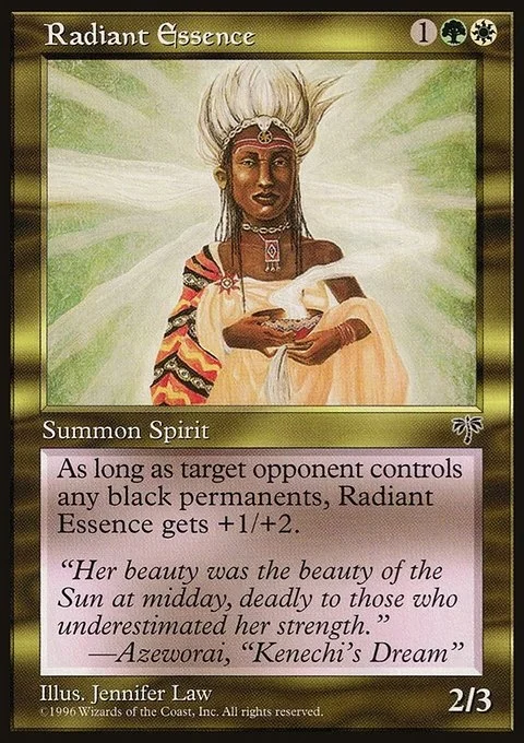 As long as target opponent controls any black permanents, Radiant Essence gets +1/+2.