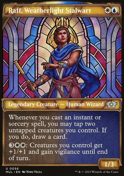 Whenever you cast an instant or sorcery spell, you may tap two untapped creatures you control. If you do, draw a card. {3}{W}{W}: Creatures you control get +1/+1 and gain vigilance until end of turn.