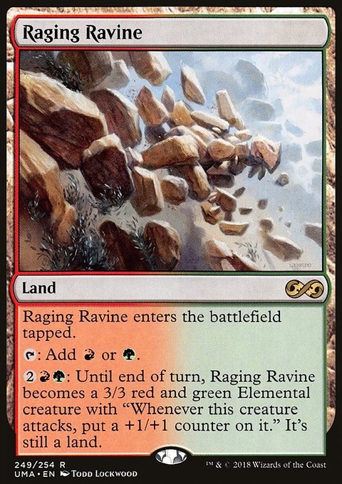 Raging Ravine enters the battlefield tapped. {T}: Add {R} or {G}. {2}{R}{G}: Until end of turn, Raging Ravine becomes a 3/3 red and green Elemental creature with "Whenever this creature attacks, put a +1/+1 counter on it." It's still a land.