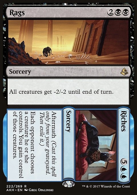 Rags All creatures get -2/-2 until end of turn. Riches Aftermath (Cast this spell only from your graveyard. Then exile it.) Each opponent chooses a creature they control. You gain control of those creatures.