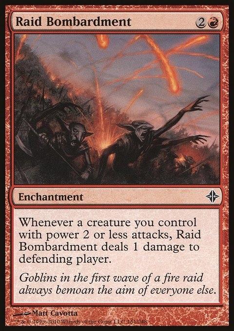 Whenever a creature you control with power 2 or less attacks, Raid Bombardment deals 1 damage to the player or planeswalker that creature is attacking.